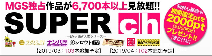 SUPER chは、MGS独占配信の人気メーカーを大量に取り揃えた超豪華な見放題チャンネルです。シロウトTV・ナンパTV・ラグジュTV・プレステージプレミアム・ドキュメンTV・ARAをお楽しみ頂けます。